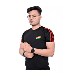 Patriotic Design: The iconic Tiranga motif across the chest proudly displays the Indian national colors – saffron, white, and green – against a bold black background for maximum visual impact.